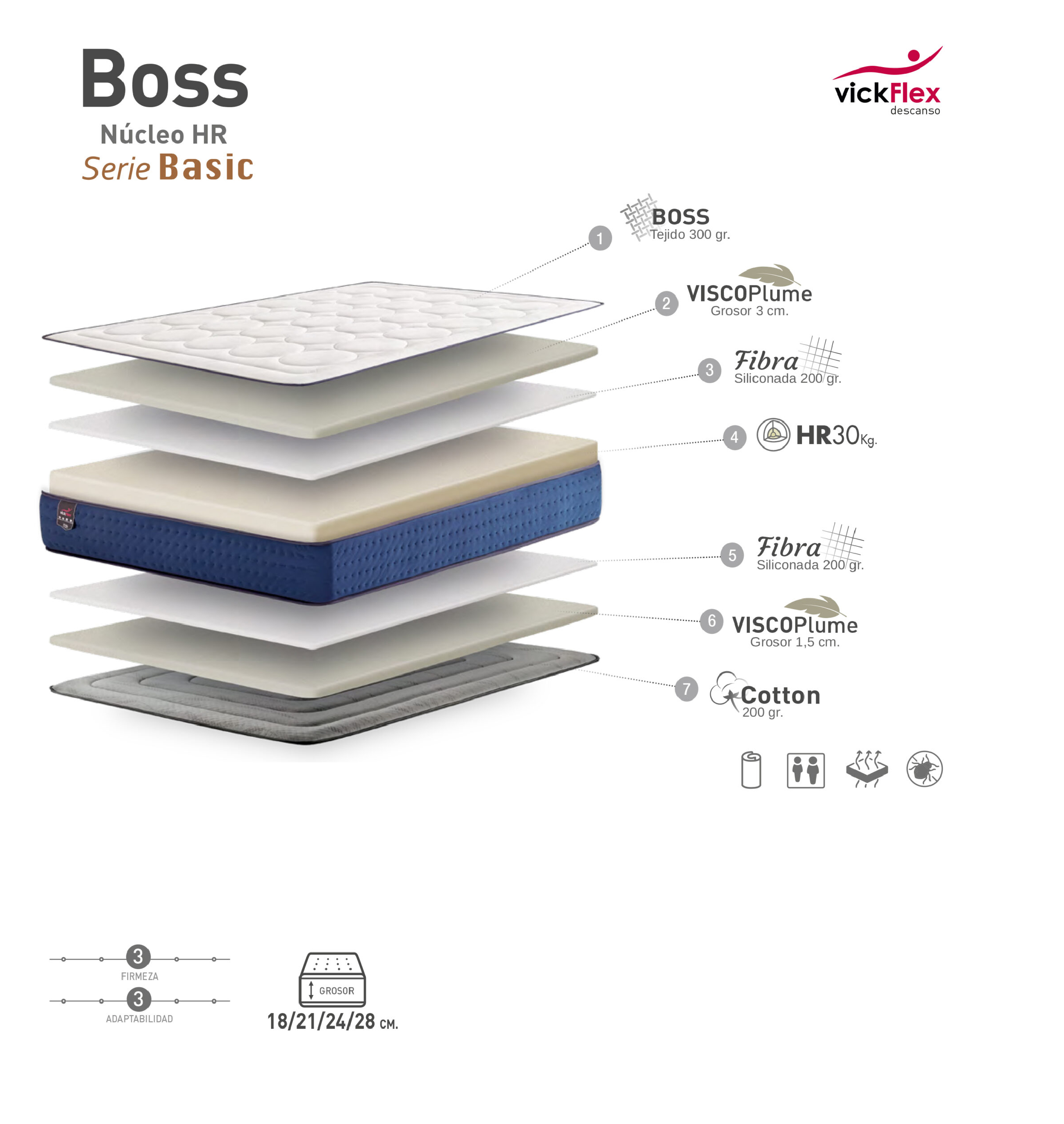 EL COLCHON BOSS ofrese una firmeza media alta gracia a su nucleo de HR 30kg de densidad asi como una buena adaptabilidad debido a sus 3cm de viscosoft plume en la cara superior.