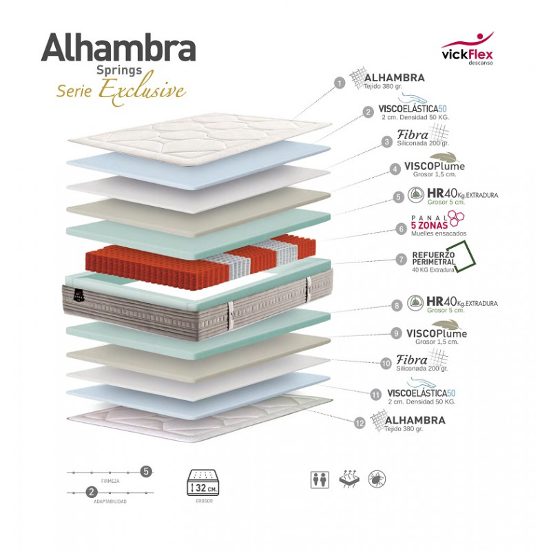 Si estás buscando un buen colchón no dudes en elegir el colchón de mulles ensacado Modelo Alhambra de 32 cm grosor con viscoelastica de 50 kg densidad por los 2 lado