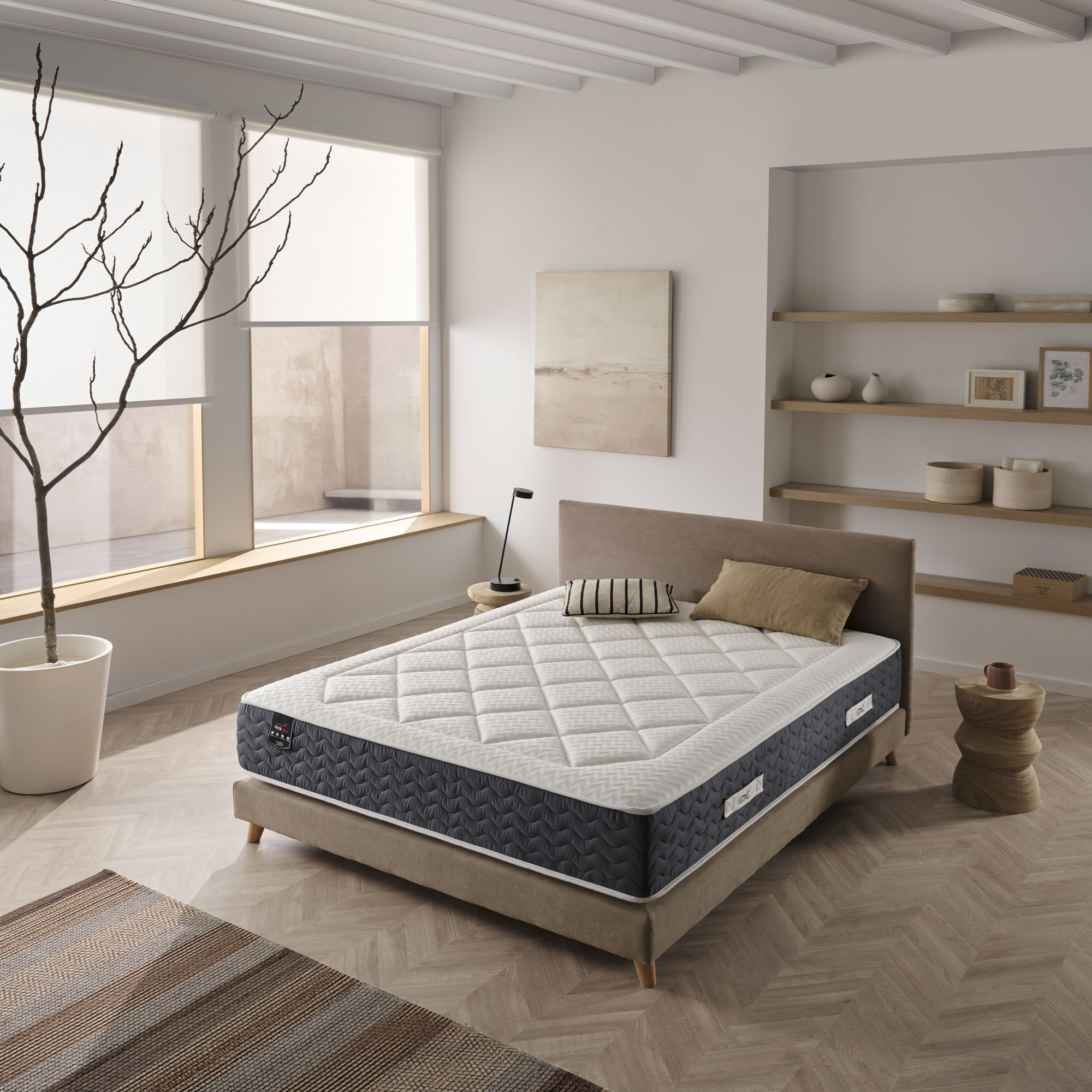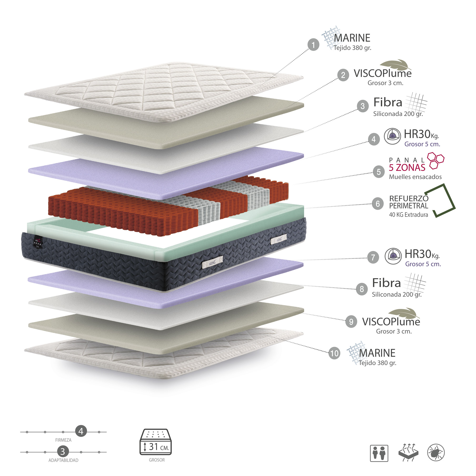MODELO MARINO es un colchon que canbia la perfeccion , su sistema central de mulles ensacados con cinco zona lumbares y panal con su 3 cm de visco , HR 3 cm en cada cara de densidad alta .