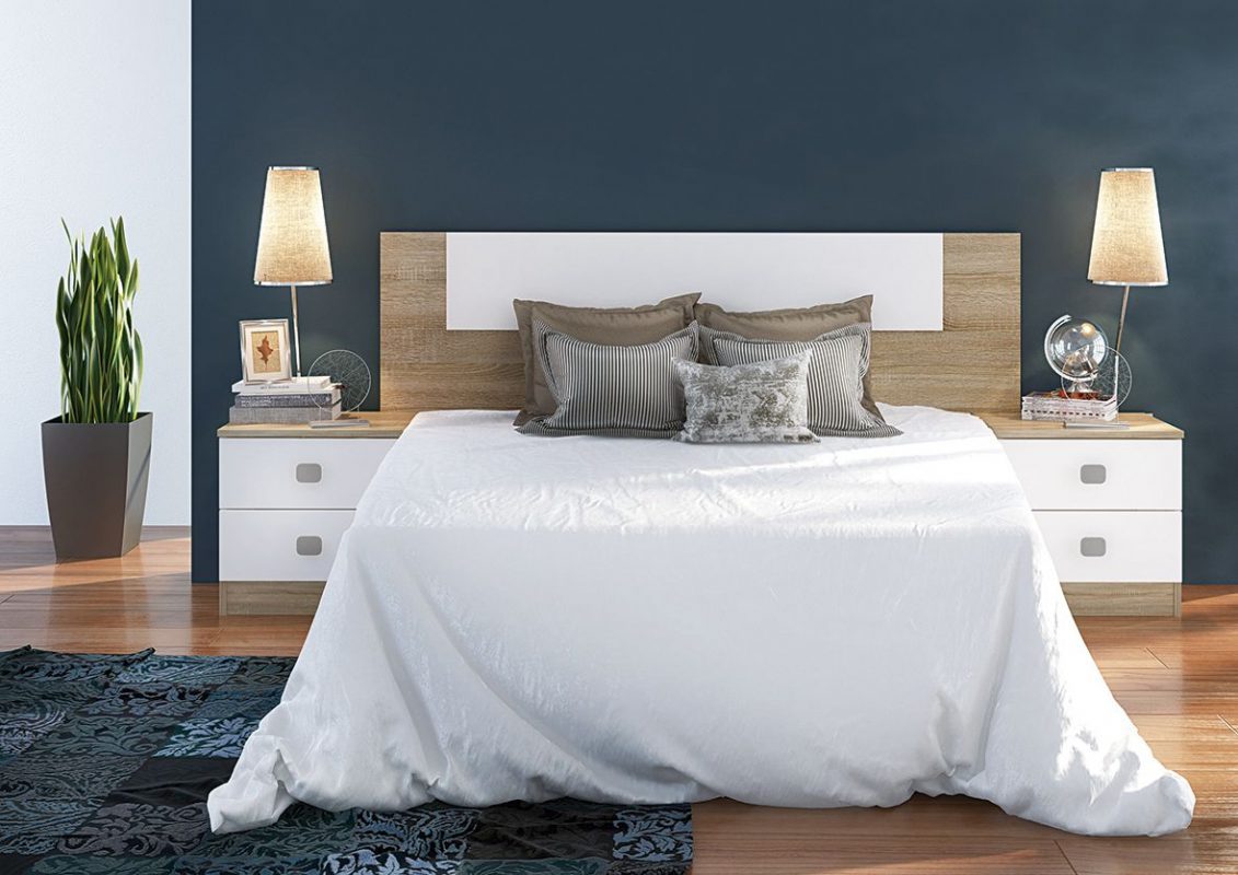 Dormitorio compuesto por cabecero y 2 mesitas de 2 cajones.