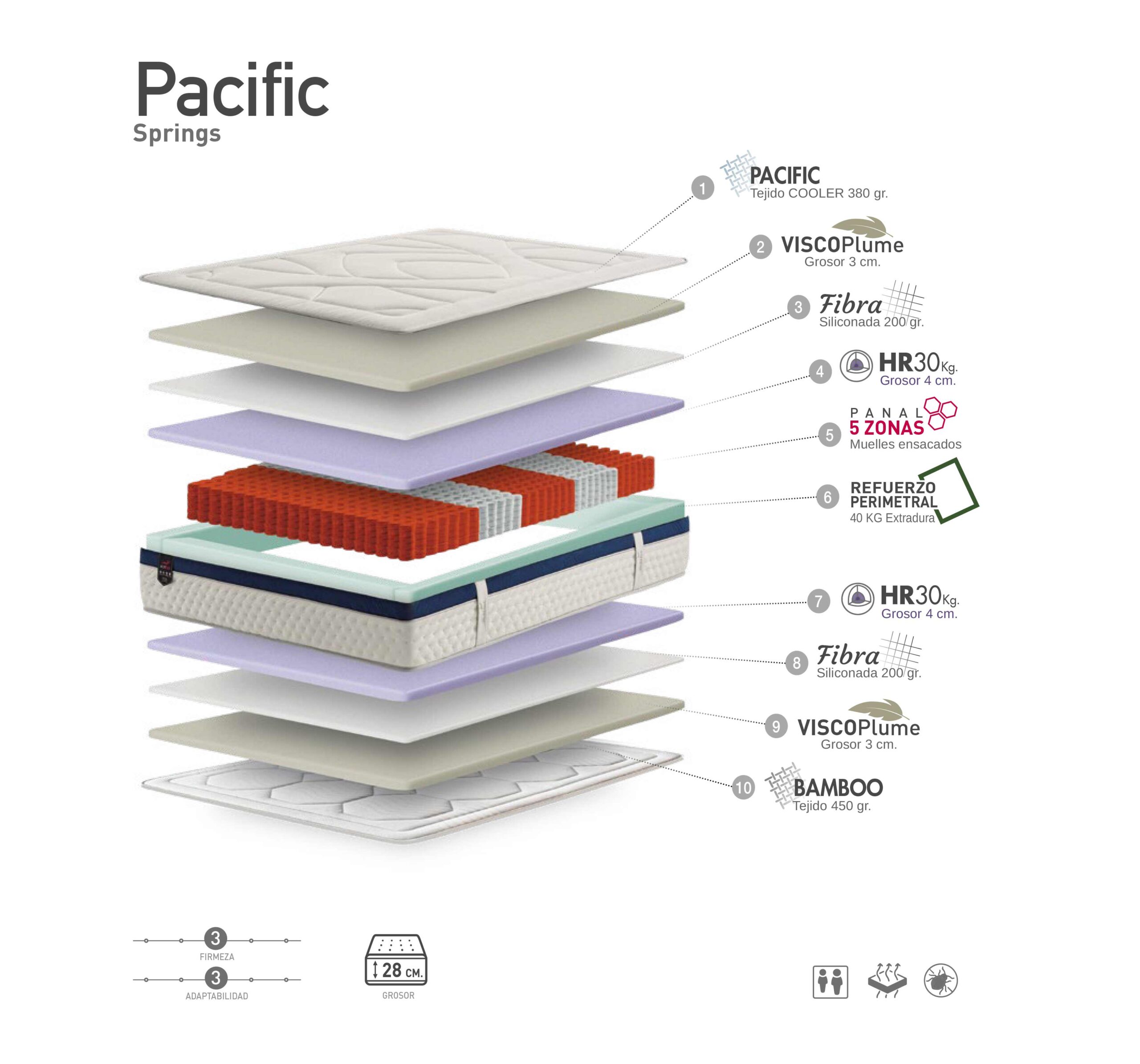 También, Pacific está dotado de 3 cm de ViscoPlume por ambas caras, lo que genera una tumbada firme repleta de confort.